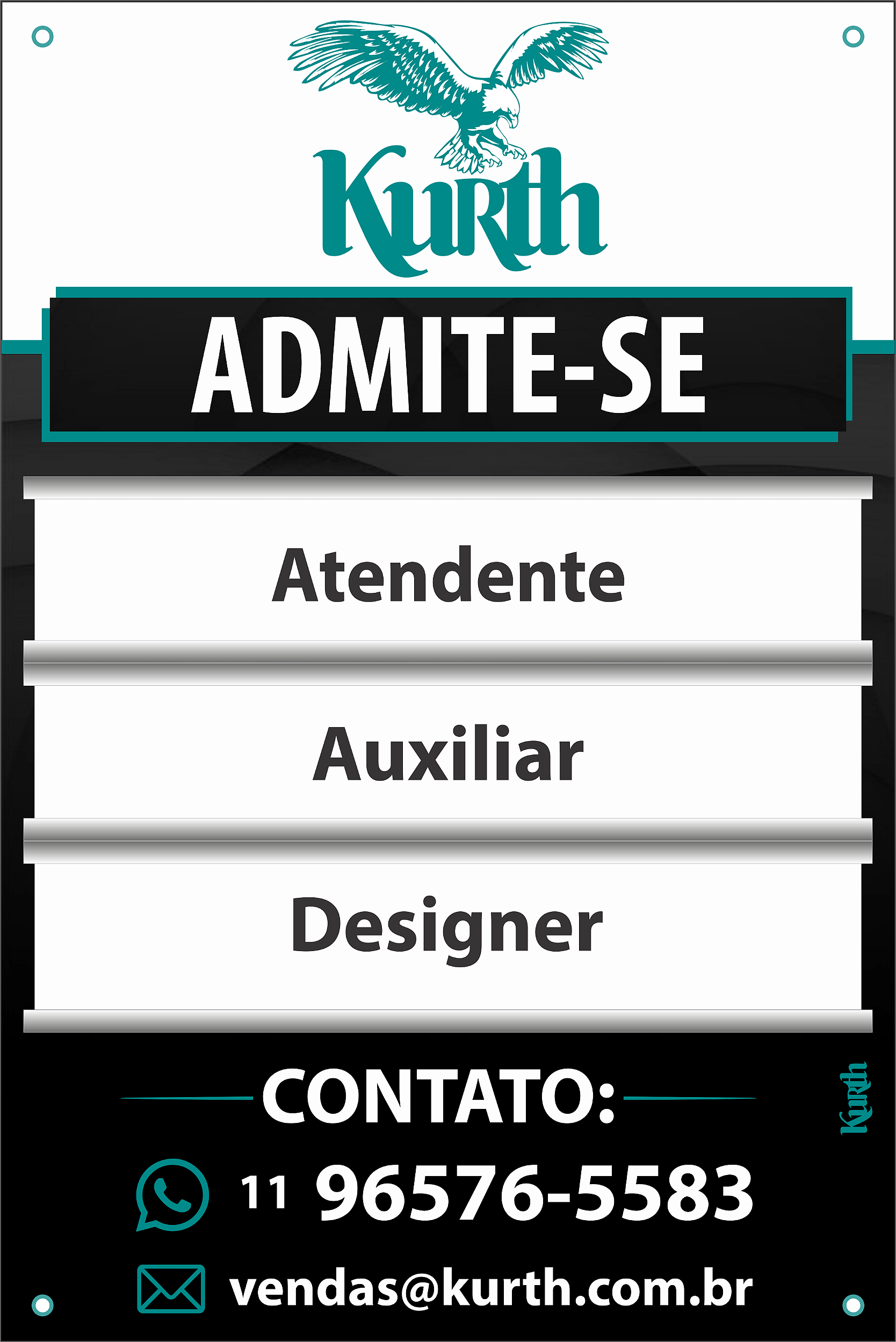 Placa admite-se, contrata-se, comunicando vagas para realizar a contratação em sua empresa. Placa totalmente personalizável com a identidade visual do seu negócio, logotipo, textos e contatos, já acompanhando 3 placas de cargo à escolha, com trilhos plásticos para efetuar a troca de cargos expostos.